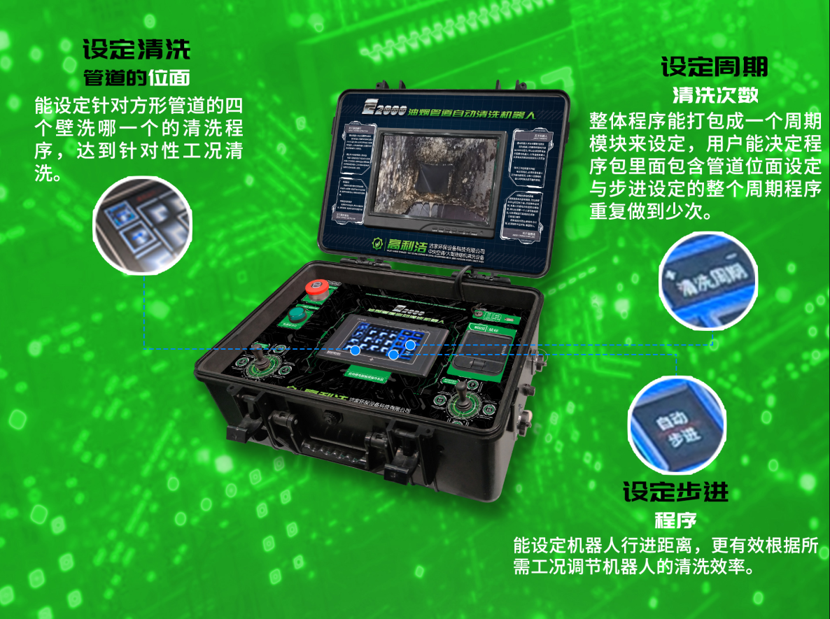 产品详情: 高利洁E2000全自动清洁机器人:设置清洁管的位置:可以设置方形管的四个壁清洁程序之一以实现目标清洁。设置清洁周期,清洁时间:总体程序可以包到循环模块中展开设置,用户可以在程序包中确定循环程序的重复次数,包括管道位置设置和步长设置。设置步长程序:可以设置机器人的行进相距,更有效地调整清洗效率根据所需的工作条件对机器人开展操作。